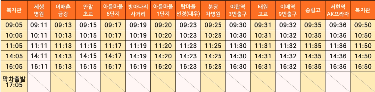복지관 출발 시간 9:05 / 10:05 / 11:05 / 오후 2:05 / 오후 4:05 / 막차 오후 5:05